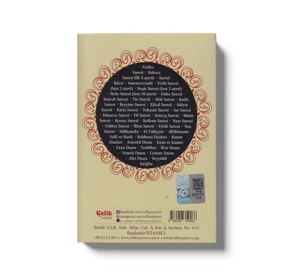 Kısa Sureler ve Dualar;Ezber Kartlarıİkram Arslan Çelik Yayınevi Dua Kitapları Fatiha Suresi • Bakara Suresi (İlk 5 ayeti) • Ayetel Kürsi • Amenerresulü • Fetih Suresi (Son 3 ayeti) • Haşir Suresi (Son 3 ayeti) • Nebe Suresi (Son 10 ayeti) • Duha Suresi • İnşirah Suresi • Tin Suresi • Alak Suresi • Kadir Suresi • Beyyine Suresi • Zilzal Suresi • Âdiyat Suresi • Kâria Suresi • Tekasür Suresi • Asr Suresi • Hümeze Suresi • Fil Suresi • Kureyş Suresi • Maûn Suresi • Kevser Suresi • Kafirun Suresi • Nasr Suresi • Tebbet Suresi • İhlas Suresi • Felak Suresi • Nas Suresi • Sübhaneke • Et-Tahiyyat • Allahümme Salli ve Barik • Rabbena Duaları • Kunut Duaları • Amentü Duası • Ezan ve Kamet • Ezan Duası • Tesbihat • İftar Duası • Yemek Duası • Cenaze Duası • Afet Duası • Seyyidül İstiğfar