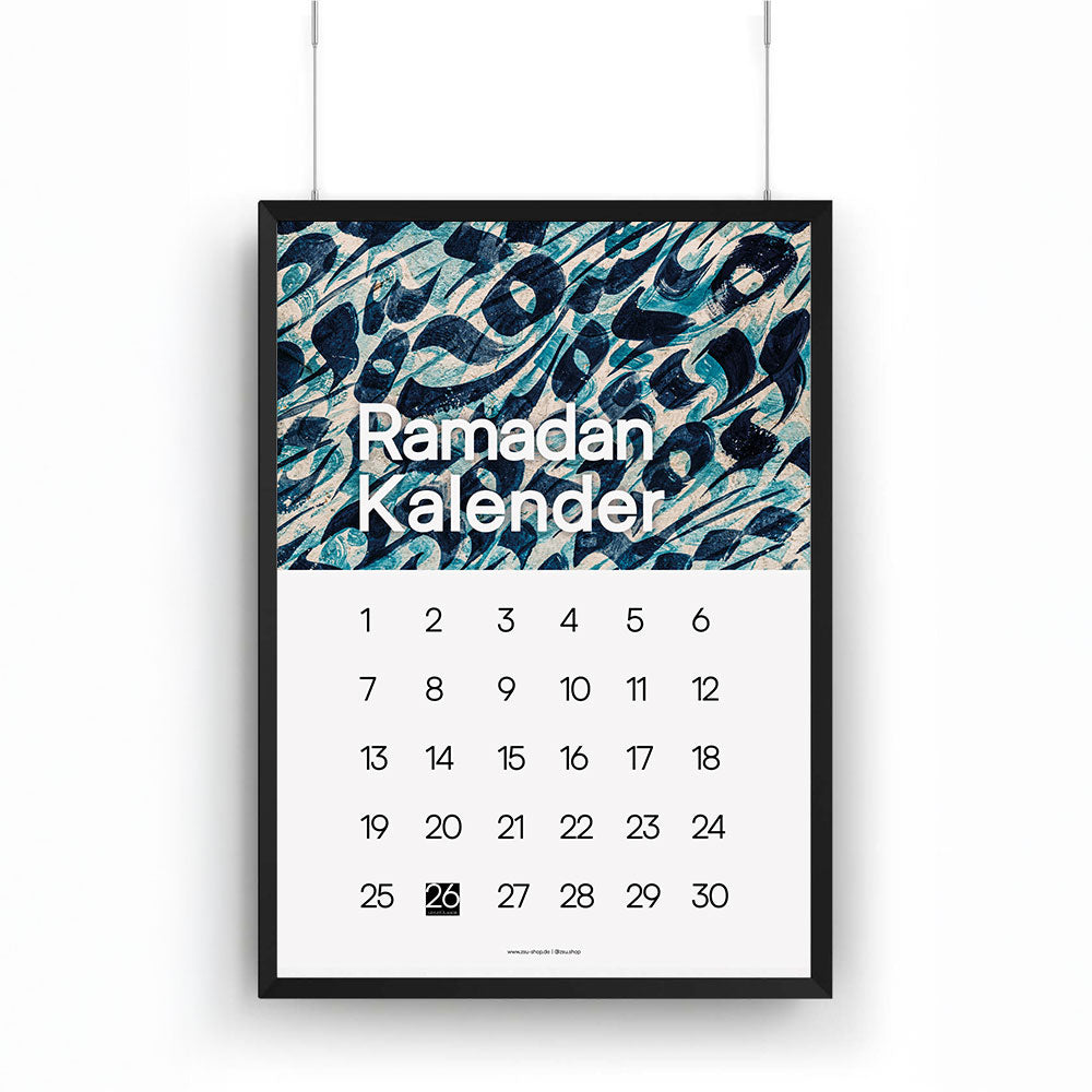 Ramadan Kalender Poster Stilvolles Kalender-Poster mit abstrakter Kalligrafie in frischen Blau- und Türkistönen. Perfekt als dekorativer Blickfang und Begleiter durch...
