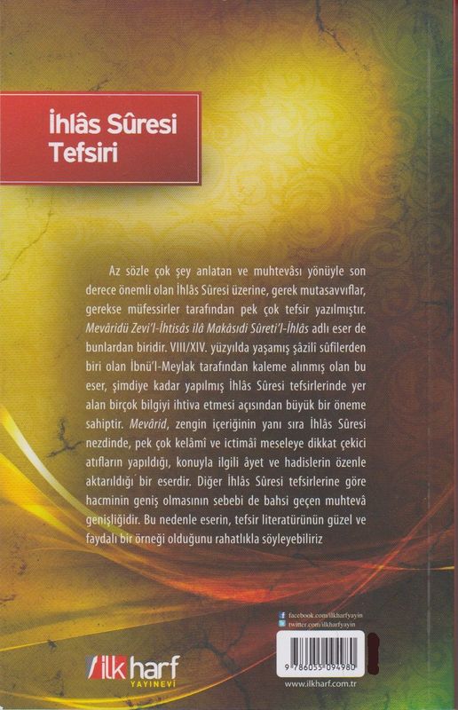 İHLAS SÜRESİ TEFSİRİYayınevi: İLK HARF YAYINEVİYazar: İBNÜ-L-MEYLAKCevirmen: BETÜL GÜÇLÜISBN: 9786055094980